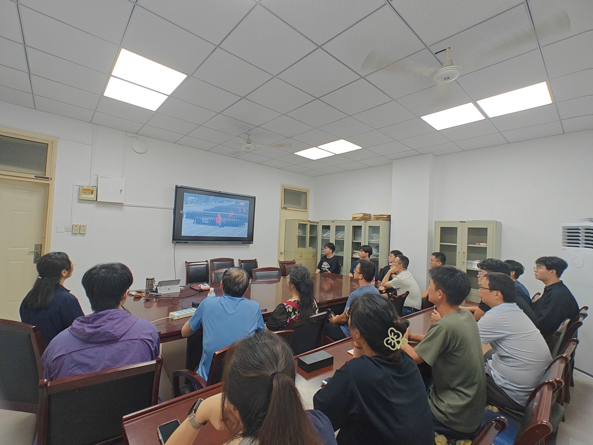 直播开始,当嘹亮的国歌奏响,鲜艳的五星红旗在屏幕上冉冉升起时,全体师生党员不约而同地起立,神情肃穆地注视着国旗,齐声高唱国歌,爱国之情在歌声中愈发浓烈。随着阅兵仪式的推进,护旗方队迈着整齐划一的步伐铿锵前行,徒步方队英姿勃发尽显军人风采,装备方队铁甲生辉展现大国实力,空中梯队战机呼啸划破长空,每一个画面都让在场的师生党员心潮澎湃。当看到与机械工程领域相关的先进装备亮相时,大家更是难掩激动,低声交流着这些装备背后的技术突破,深切感受到国家科技发展的迅猛势头。