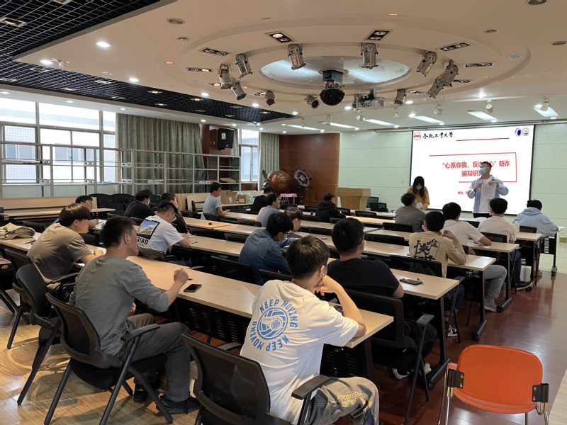 活动前夕,主持人刘韦铭跟同学们一起学习了各类别的诈骗手段,包括投资理财、杀猪盘诈骗、假冒客服退赔、冒充领导骗钱、网上兼职刷单、网络贷款诈骗、冒充公检法诈骗等。