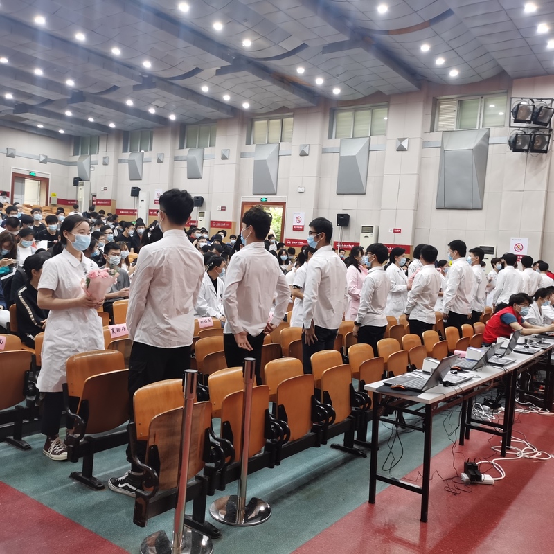 11名研究生代表已经手捧一束鲜艳芬芳的康乃馨,戴着口罩身着正装落座在观众席。随着活动的推进,11位研究生代表以饱满的精神状态,整齐划一地走向前排的护士们。随后,同学们一对一站在护士们的面前,身体微微前倾,双手献上鲜花,并向面前的护士们送上祝福:“护士姐姐,你们辛苦了,祝你们节日快乐!”护士们接过鲜花,也微笑着向同学们致谢。