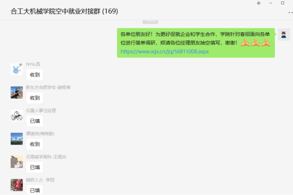 将面向企业的调研问卷发布在了新建的就业对接群里,将结合学生调研进行系统施策,据了解,对接群建成两天已有150余家单位相继进群。