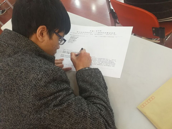 此次测试紧密围绕党的十九大报告和新修订的《中国共产党章程》等内容,包含了过去五年的历史性成就、新时代共产党的历史使命、习近平新时代中国特色社会主义思想和党的执政能力建设等要点,内容全面,题型多样,分为填空题、判断题、简答题和论述题等。测试现场,全体学生党员认真思考作答,在规定的答题时间内一气呵成,达到了“以考促学、以考促记、以考敦行,以考营造”的学习氛围,加深了同学们对十九大精神的掌握和理解。大家纷纷表示,在今后的学习和工作中,要坚持用十九大精神武装头脑、指导实践,立足本职岗位,努力创先争优,以实际行动贯彻落实党的十九大精神。