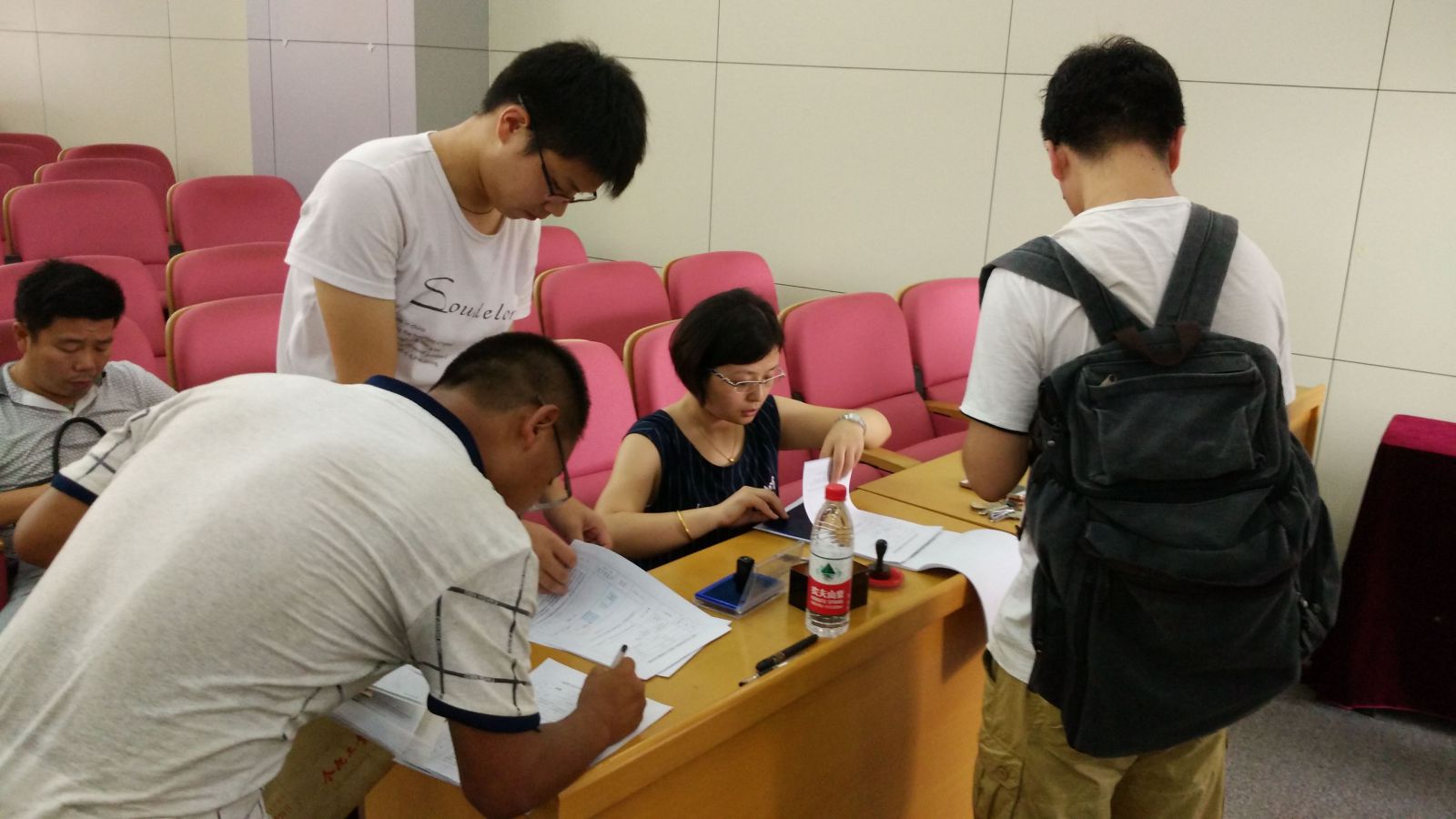 为方便新生报到,水果派解说 迎新工作小组在格物楼214提供一站式服务,入学程序简化而高效。在研究生教务员沈老师的带领下,志愿者们分工明确,有条不紊地进行着报到学生的信息统计、资料收集与发放工作,对于新生遇到的各种问题,他们耐心解答,整个迎新工作紧张有序地进行。研究生辅导员侯老师积极的帮助家庭经济困难的新生办理“绿色通道”,并对学生的家庭和思想状况都做了详细的记录,努力帮助新生解决学习、生活问题,使他们将更多的精力投入到学习中。学院领导也高度重视迎新工作,黄海鸿副院长亲自到迎新现场慰问迎新工作人员和新生,关切询问报到情况,在肯定工作成效的同时提出一些建议,促使迎新工作做到更好。