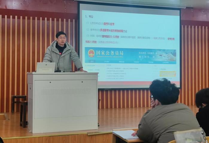 就业网站的相关内容板块,并就企业招聘宣讲会信息、招聘简章等相关内容做了重点介绍;随后就考公考编时间线、报考事宜、复习准备等做了基本分享,对于同学们关注度相对较高的“选调生”报考等政策做了宣讲。对于有升学、考研计划的同学就相关重要时间节点、报考注意事项、考研准备攻略等做了详细指导;最后就同学们关心的“征兵入伍”“推免夏令营”等事宜做了简要介绍。在总结讲话中,年级辅导员表示希望与会同学们能够积极开展自我探索,尽快明晰职业发展方向,做好及时查漏补缺,为接下来的就业准备做好积极应对。