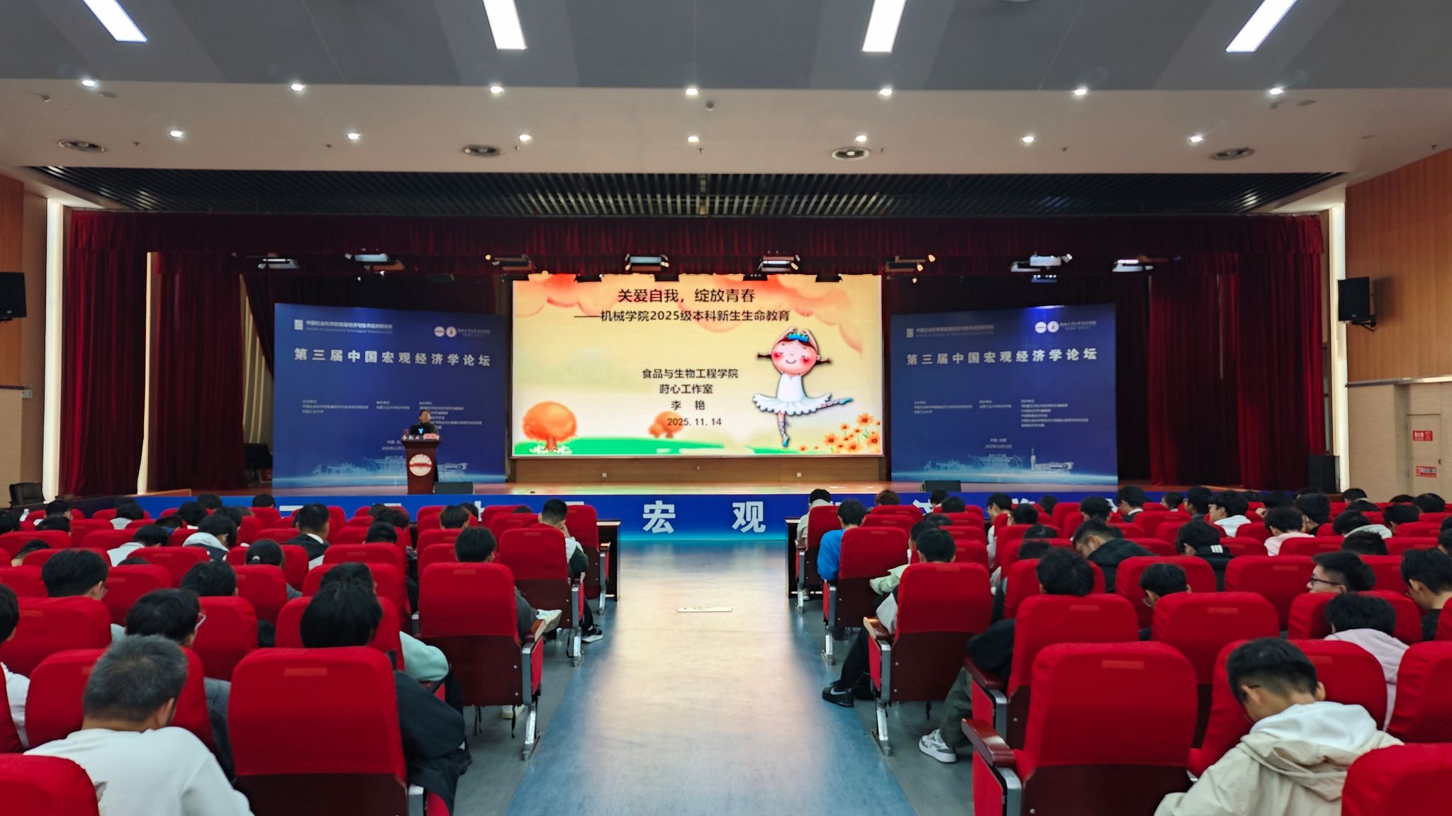 于11月14日在翡翠湖校区科教楼二楼报告厅举办“关爱自我,绽放青春”主题讲座,本次讲座邀请食品与生物工程学院党委副书记兼纪委书记、安徽省名师工作室莳心工作室负责人李艳老师担任主讲人,2025级全体新生参加本次讲座。