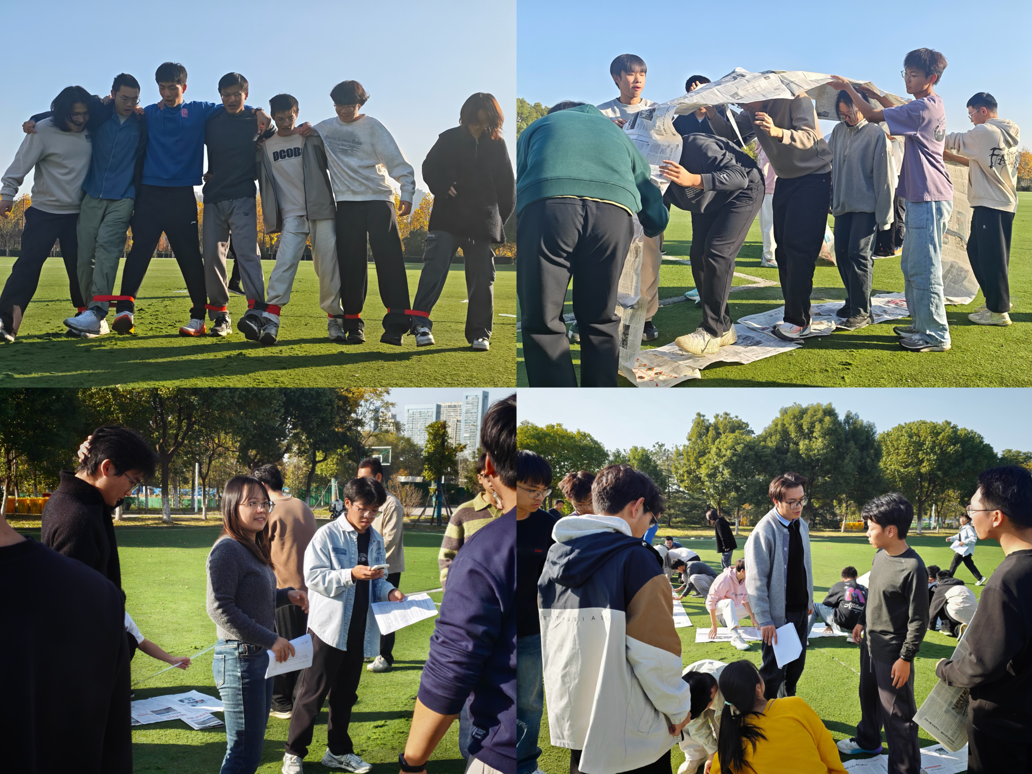 活动在“破冰启动”环节中拉开帷幕。主持人引导全体同学围成一圈,通过“身体签名”游戏促进互动。在“肩膀碰触”“击掌加油”等趣味指令中,现场气氛迅速升温,同学们逐渐打破隔阂。随后的“协作竞技”环节中,各小组依次挑战三项任务:利用PVC管接力传递乒乓球,考验团队的策略与配合;用报纸制作“履带”协同行进,激发创新思维与协作精神;以及绑腿横向移动,锻炼队员之间的同步与支持。现场欢呼不断,大家在竞技中深刻体会到领导力与团结协作的重要性。最后的“沉淀分享”环节中,全体同学参与了“梦想高飞”纸飞机放飞活动,将写有个人期待与目标的纸飞机一同放飞,象征着携手共进、展望未来。主持人在总结中强调,本次活动中积累的协作经验可迁移至未来的学生工作中,有效提升岗位胜任力。