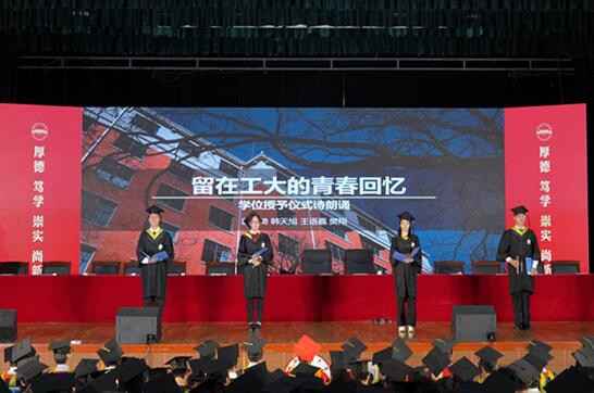 师生送别环节,教师代表深情演绎了《送别》,学生代表以诗歌朗诵的方式带领同学们深情回顾了“留在工大的青春回忆”,仪式在全场高呼“我们毕业了,我们永远爱你,我的合工大!”的动人场景中拉下帷幕。