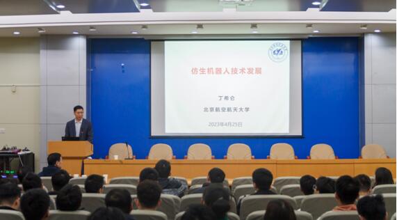 丁希仑教授以“仿生机器人技术发展”为题为参会师生作了精彩详实的报告。结合国内外仿生机器人研究的发展现状,介绍了机器人仿生研究的关键科学问题及研究方向。围绕“环境高适应、作业高稳定、运动高敏捷”的技术要求,从“仿生机构、仿生材料与驱动、仿生功能表面设计制造、仿生智能感知与控制”四个方面详细介绍了北航研究团队的代表性技术成果。针对“多栖域、多功能、高适应、高稳定、高敏捷”的难题挑战,介绍重点攻关方向-海陆空跨域多栖仿生机器人。
