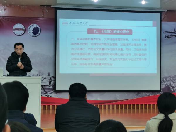 为进一步加强研究生导师队伍建设,规范指导行为,努力造就有理想信念、有道德情操、有扎实学识、有仁爱之心的新时代优秀导师,11月25日下午3点,学院副院长祖磊在机械楼214向全院导师解读相关政策及《研究生导师指导行为准则》内容,学院领导班子、全院导师、教工参加此次集中学习。