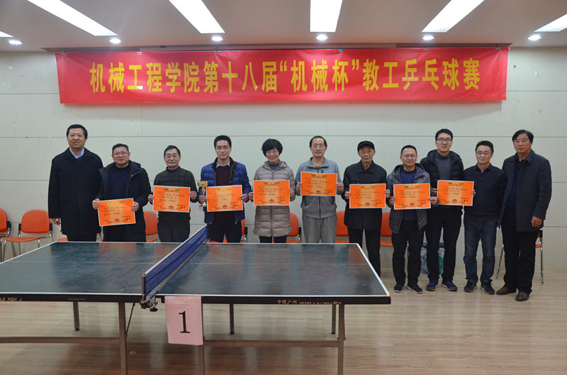 教职工积极进取的精神风貌和强烈的集体荣誉感。参赛教职工精湛的球技、出色的发挥,扣人心弦、精彩纷呈,博得在场观众的热烈掌声和阵阵喝彩声。窗外寒风刺骨、室内欢声笑语。平时沉浸于教学科研中的各位老师抓住这一难得的机会,在挥汗如雨的比赛间隙相互问候、交流、攀谈,身心得到了彻底的放松。经过六轮紧张激烈的角逐,男子团体冠军由设计2队摘得,机关队荣获亚军,设计1队、工程图学队、元老队、真空队、机电队、摩擦所队分获团体三至八名。孟冠军勇摘男子单打冠军,女子单打冠军由肖云获得。学院党委书记韩江、副院长黄康、行政副院长及院工会主席左登发为获得团体前八名的参赛队颁奖。