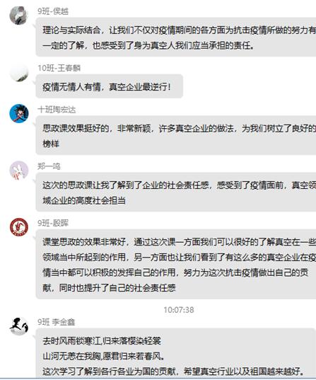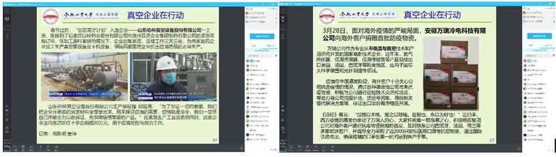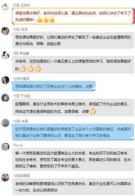 为了介绍行业企业情况和培养学生的社会责任感,真空与过程装备系在《真空系统测量与检漏》专业课程线上授课期间,增加课程思政专题,利用课间时间进行了一次“疫情防控与社会责任”特别班会,介绍疫情期间全国部分真空企业在疫情期间保障生产的同时,积极为抗击疫情贡献力量。