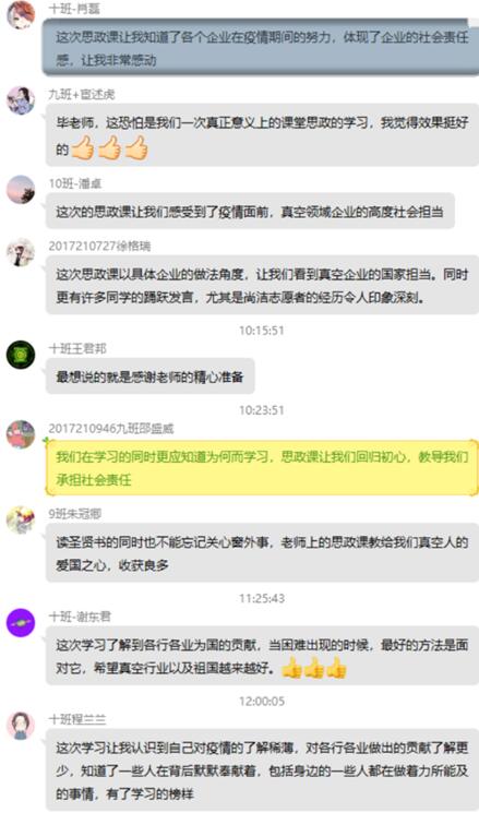 班会过程中还设计了学生讨论环节,通过腾讯课堂的发言功能,学生轮流就“社会责任”这一主题发表自己的认识和感想。