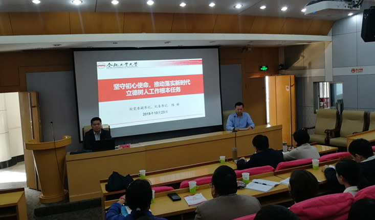 为深入开展“不忘初心、牢记使命”主题教育,切实提升学习教育成效,10月23日下午,学校党委副书记、纪委书记陆林在学术会议中心小报告厅上了题为《坚守初心使命,推动落实新时代立德树人工作根本任务》专题党课,学院党委相关负责同志、学院主题教育领导小组办公室成员、学院教师和学生党员代表、学院入党积极分子班学员以及学校纪委办公室、监察处、工会、审计处相关负责同志共100余人聆听了此次党课,党课由学院党委书记韩江同志主持。