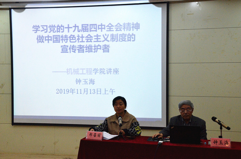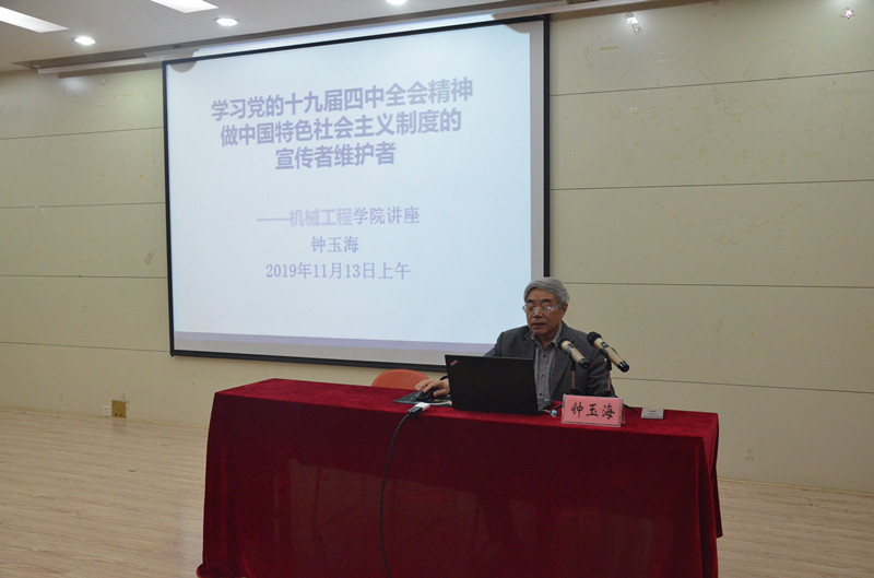 在屯溪路校区格物楼多功能厅开展中国共产党十九届四中全会精神专题学习活动,校关工委钟玉海教授应邀作了《学习党的十九届四中全会精神,中国特色社会主义制度的宣传者维护者》专题辅导报告,该院党委相关负责同志、政工干部、教师党员代表、学生党员代表共70余人参与了此次活动。