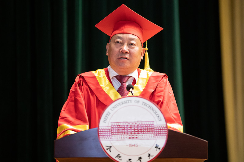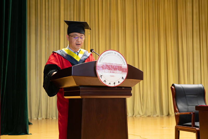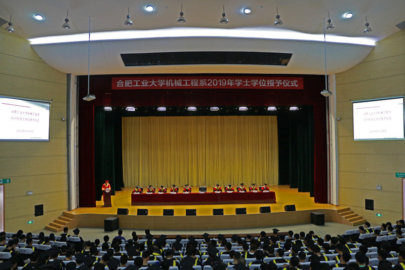 学位委员会副主席、书记韩江老师,宣城校区学生工作办公室主任陈发祥老师,汽车与交通工程学院学位委员会委员、副院长卢剑伟老师,机械设计工程系主任王勇老师,机械电子工程系主任曾亿山老师,机械制造工程系副主任唐火红老师,真空与过程装备工程系唐志国老师,制冷与低温工程系副主任唐景春老师以及机械工程系教工党支部书记刘勇老师出席仪式。同时参与仪式的还有机械工程系教师代表以及2019届全体本科毕业生及部分学生家长。仪式由水果派解说