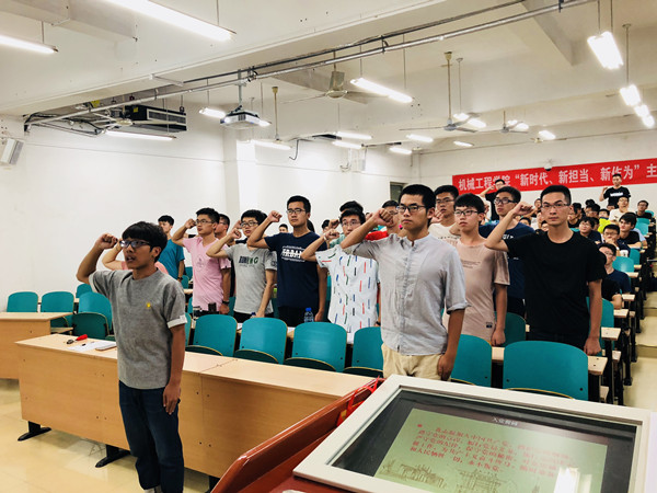 活动在雄壮的国歌中开始,在支部党员汪杰的带领下,全体党员佩戴党徽,面向党旗,举起右手,紧握拳头,庄严宣誓。支部新党员代表王硕同学做出承诺道:今后将做马克思主义的坚定信仰者、做校规校纪的模范遵守者、做学习创新的带动引领者、做优良风气的积极传播者、做创先争优的忠实践行者。