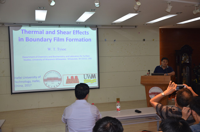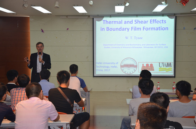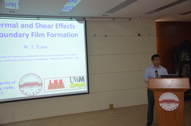 讲学与学术交流。Tysoe教授报告主题是“固-固滑动界面的原位化学反应过程和动力学模型”(In-situ Modeling of Reaction Pathways and Kinetics at a Sliding Solid-Solid Interface),报告主要从微观角度探讨了在滑动过程中固体摩擦表面边界膜的形成过程,通过超真空摩擦实验和多种原位检测手段,多角度分析还原了摩擦过程中的分子尺度上的化学反应过程,以此建立了分子动力学反应模型,并验证了相关的摩擦化学反应机理。持续一个多小时的报告深入浅出的介绍了原位检测技术在微观摩擦学上的应用,巧妙的实验安排和缜密的逻辑分析让广大师生耳目一新,收获良多,最后广大师生和Tysoe教授就报告内容进行了的讨论。