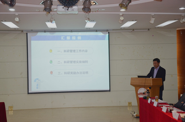 学院副院长黄海鸿教授代表学院做了学院科研工作报告。他重点回顾了2016年度学院科研整体情况,报告了2017年度学院科研工作计划及目前的完成情况,同时强调了近期学院的科研工作重点,并希望学院教师要转变科研思路、提升科研质量、共同推进学院科研事业发展。随后,院长助理王道明和叶家鑫分别就学院科研管理与科研奖励政策、研究生培养工作政策分别进行了汇报和解读。