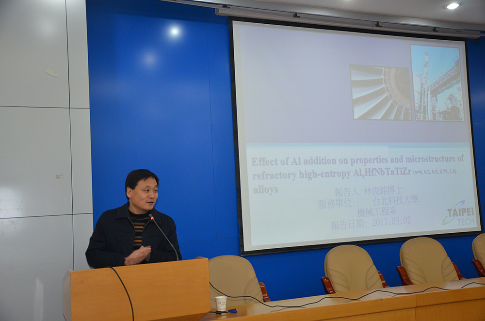 林俊铭博士首先从航太工业中面临的螺旋桨叶片冷却法造成的额外机身重量及能耗问题讲起,介绍了美国空军实验室研发的以五种以上主要元素设计的新型耐火高熵合金;接着,阐述了采用耐火金属作为高熵合金组分存在的缺点,并以此引入了团队的研究动机;其次,林博士介绍了该研究的具体实验流程,并着重分析了Al作为添加剂对于高熵合金各项材料性能的影响机理及规律;最后,林博士总结了本研究的主要贡献,并指出了该领域未来的主要研究方向。报告后,在场师生与林俊铭博士进行了关于学术论文写作、实验数据处理以及高熵合金前沿领域方面的讨论与交流。 (王道明/文、图)