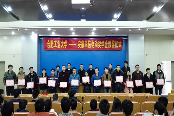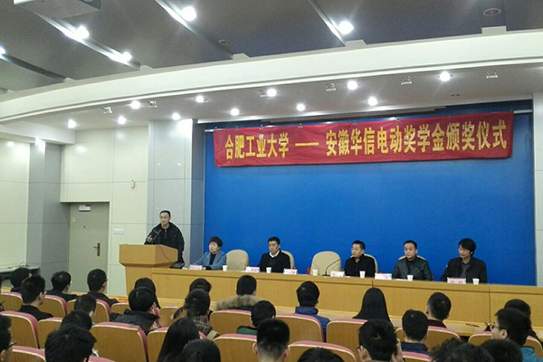 第一届“合肥工大-安徽华信电动奖学金”颁奖仪式在屯溪路校区格物楼214报告厅举行。出席仪式的嘉宾有安徽华信电动科技股份有限公司董事长杨善春、安徽华信电动副总彭勇成、安徽华信电动总工程师范杰、安徽华信电动总经理助理张超,水果派解说