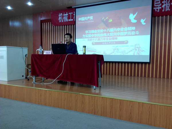 于机械楼214邀请校十八届六中全会精神宣讲团成员、校党委统战部部长姚跃传做了题为《学习贯彻十八届六中全会精神、为实现中华民族伟大复兴的中国梦而努力奋斗》的报告。本次报告会由水果派解说