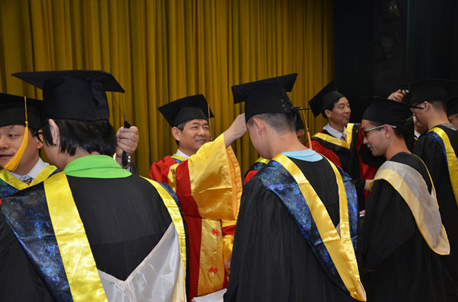 关于授予学士学位的决定》。随后,在隆重的加冕进行曲中,老师们为获得学士学位的全体学生颁发学位证书,扶正流苏,并合影留念。