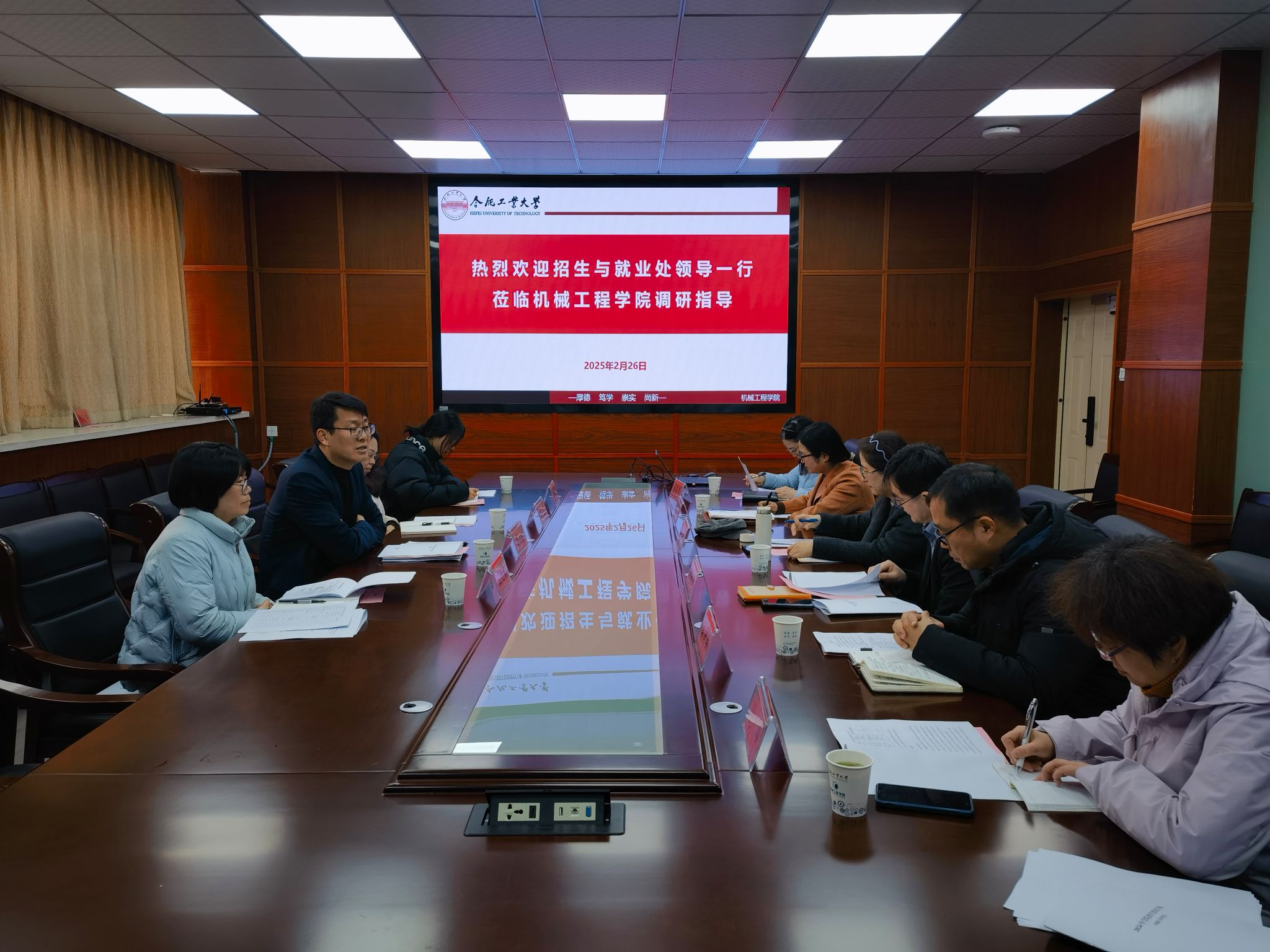 的招生与就业处领导有处长李洪涛、副处长胡佳,招生科科长石鸽娅和科员陈静怡。学院副院长赵萍主持会议,副书记蔡伟伟、副院长马培勇以及学院教学秘书参加会议。
