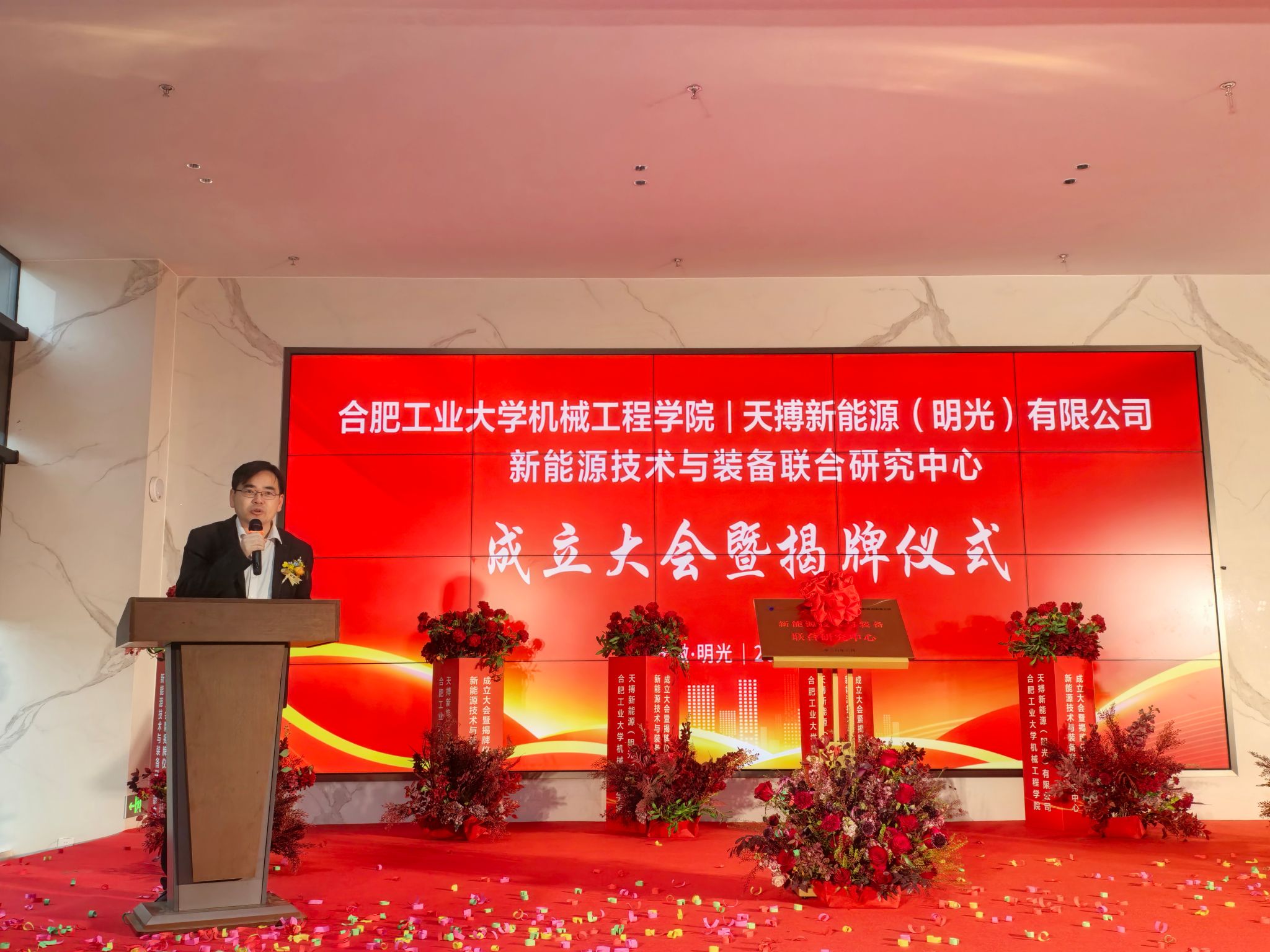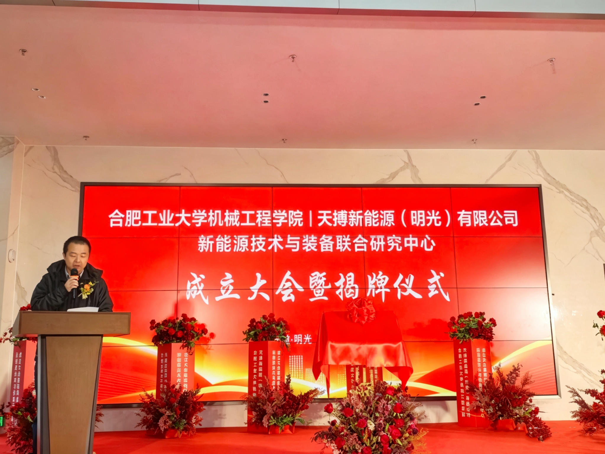 ——天搏新能源(明光)有限公司 “新能源技术与装备联合研究中心”揭牌仪式暨成立大会,在天搏新能源(明光)有限公司隆重举行。明光市政府副市长朱其昊、相关部门负责人,水果派解说