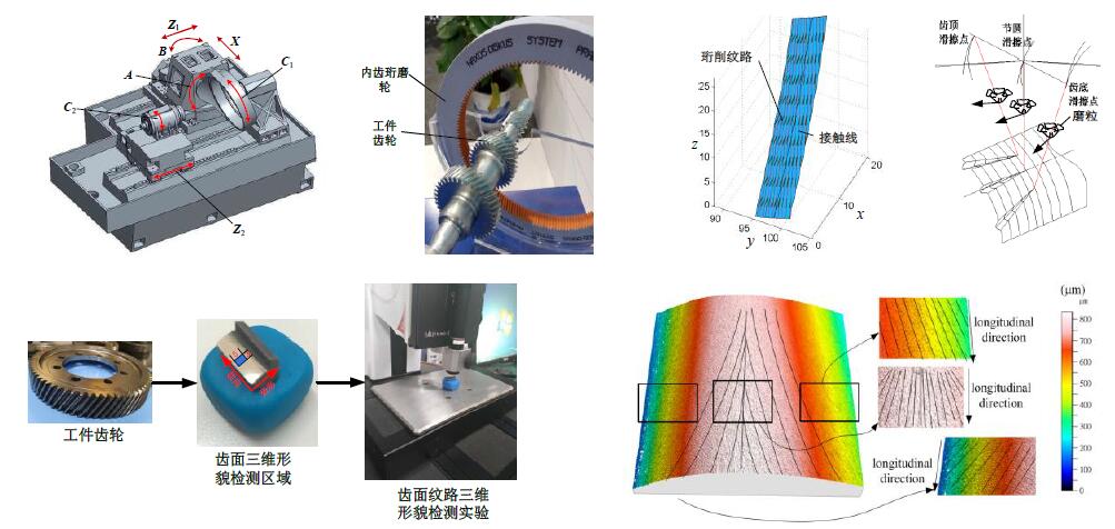 在国家科技重大专项Y4830CNC 数控内齿珩轮强力珩齿机和自然科学基金项目数控内齿珩轮强力珩齿机理研究支持下,建立了内齿珩轮强力珩齿工件齿面珩削纹路轨迹的三维模型;提出了一种基于内齿珩轮强力珩齿啮合磨削运动学的珩削工件齿面粗糙度建模方法并对内齿珩轮强力珩齿工件齿面形貌和残余应力等齿面质量进行了一些列的机理性研究工作。