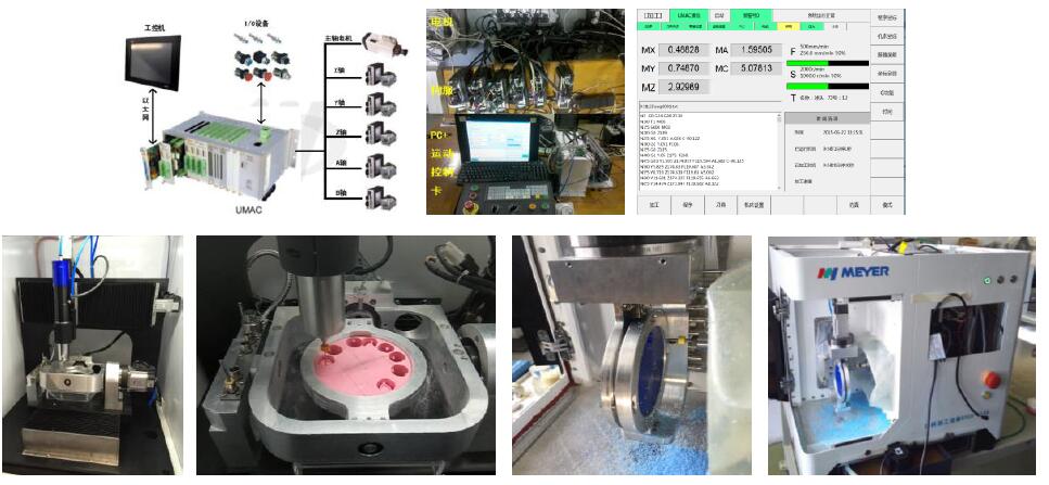 在安徽省自主创新专项“高性能智能化数控系统开发”和企业合作项目“数字化口腔义齿集成(制造)系统”的资助下完成了通用五轴机床数控系统的研发,如图所示;系统采用基于PC 的开放式数控系统体系结构:硬件平台采用了以具有以太网接口的一体式PC 机,软件平台为开放式体系结构:WindowsXP 操作系统、RTX 实时软件包和基于Windows 的图形接口,采用PC 和实时控制内核完成实时控制。该系统已成功应用于与合肥美亚光电技术股份有限公司共同研发的五轴联动数控义齿加工设备中。