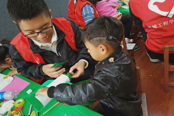本次活动主要是以绘画和手工制作为主线,通过志愿者前期的精心准备和听障儿童共同完成了卡通人物绘画并进行了树叶填充,在塑料飞机制作环节中,志愿者们拿出塑料瓶时,孩子们脸上都写满了迷茫,但是在志愿者们做好机翼后,孩子们充满了好奇和兴趣,最终在共同努力下,完成了机身整体的制作,志愿者的细心和孩子们的笑脸让教室充满着无限的温馨。