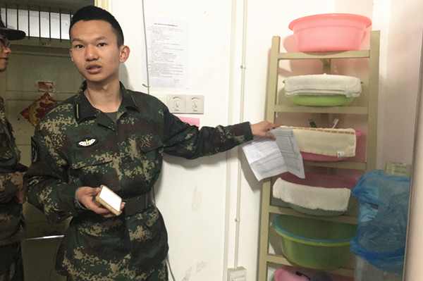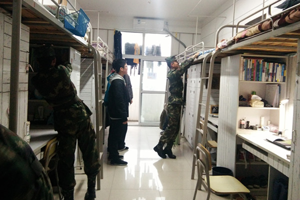 2016级宿舍卫生要求》的内容进行整改,其中大至宿舍卫生间、居住区、阳台三大区域,细至寝室内电线、网线的规划、洗漱用品、闲置物品的摆放等都有要求。此次大扫除还请到了20名16级国防生同学组成“专家团”,他们每6人一组,分别对12号南楼4、5、6层机械学院男寝进行内务指导和检查。每一层楼,国防生们都会随机挑选1到2间宿舍进行细致的整改,并以此作为示例,邀请各寝室寝室长前来学习。在此过程中,同学们既学到了一些整理内务的技巧,同时也使寝室风气焕然一新。